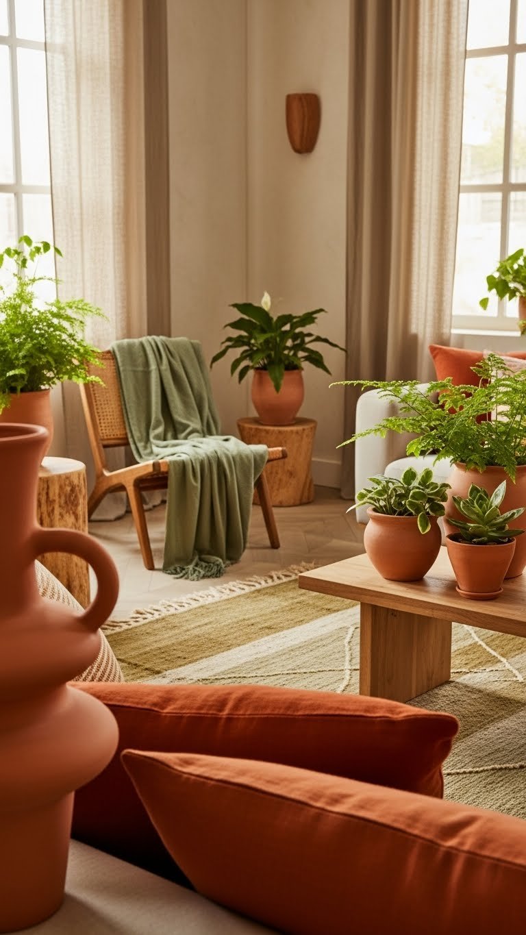 When you introduce terracotta and earthy greens, the room instantly feels grounded and inviting—you’ll get warmth from clay tones and freshness from muted sage without overpowering the space. Use terracotta accents in pots, throw pillows, or a sculptural vase, and layer earthy greens through plants, rugs, or cushions. That balance keeps the room free, calm, and effortlessly lived-in.