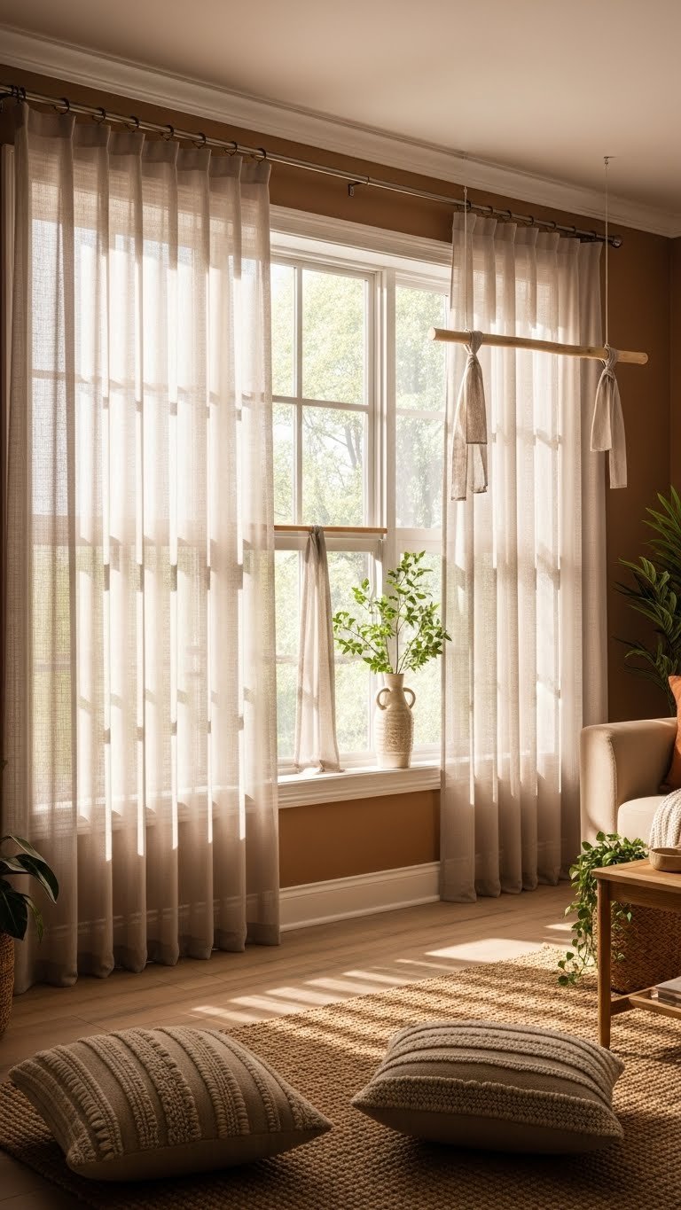 To keep that warm, earth-toned look feeling light and airy, swap heavy drapes for sheer or lightweight panels. You’ll let sunlight breathe through while maintaining privacy filters with layered sheers or discreet liners.