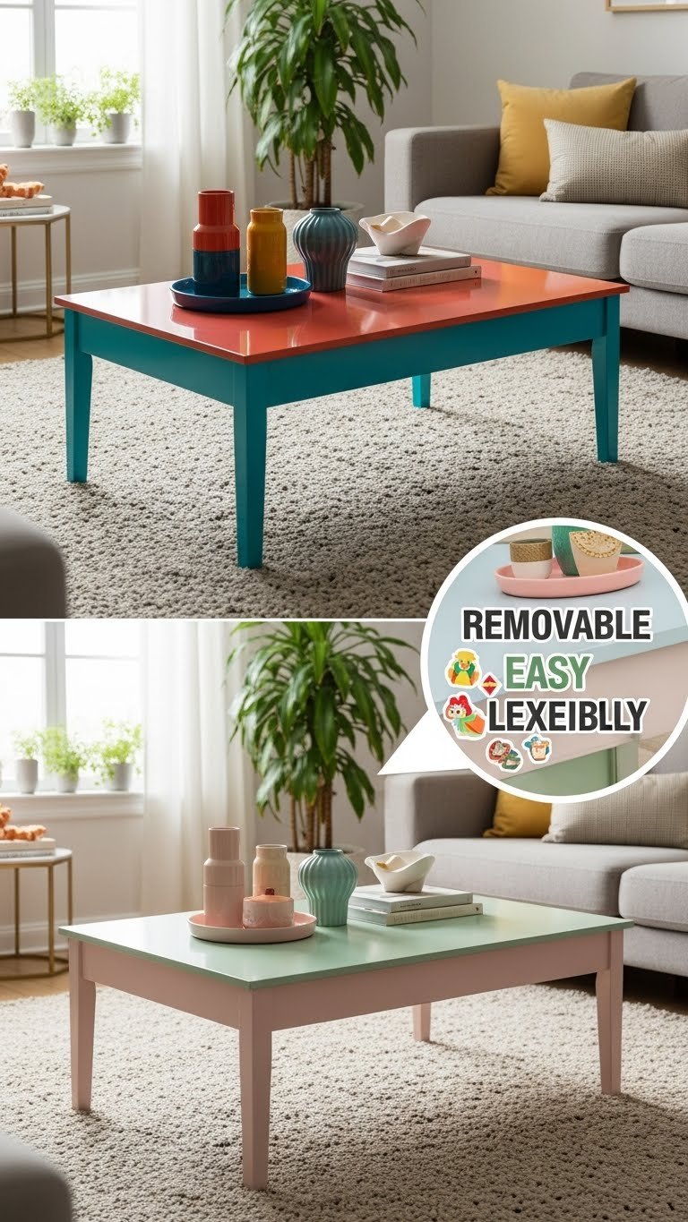 Introduce a colored coffee table to act as a replaceable anchor that instantly refreshes your living room’s palette and mood. Pick a piece in vibrant lacquer for bold impact, or choose softer hues to lift the room. You’ll swap it seasonally or whenever you crave change; use removable decals to personalize without commitment, keeping the space playful, flexible, and effortlessly yours.