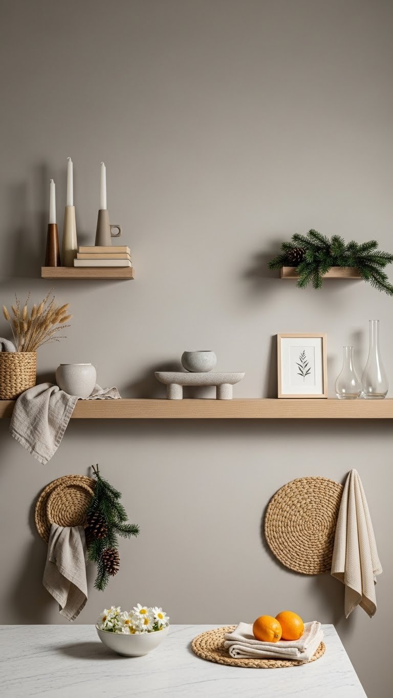 You’ll favor mantel symmetry with a central anchor and mirrored small objects; practice tactile rotation by exchanging textures and colors each season.