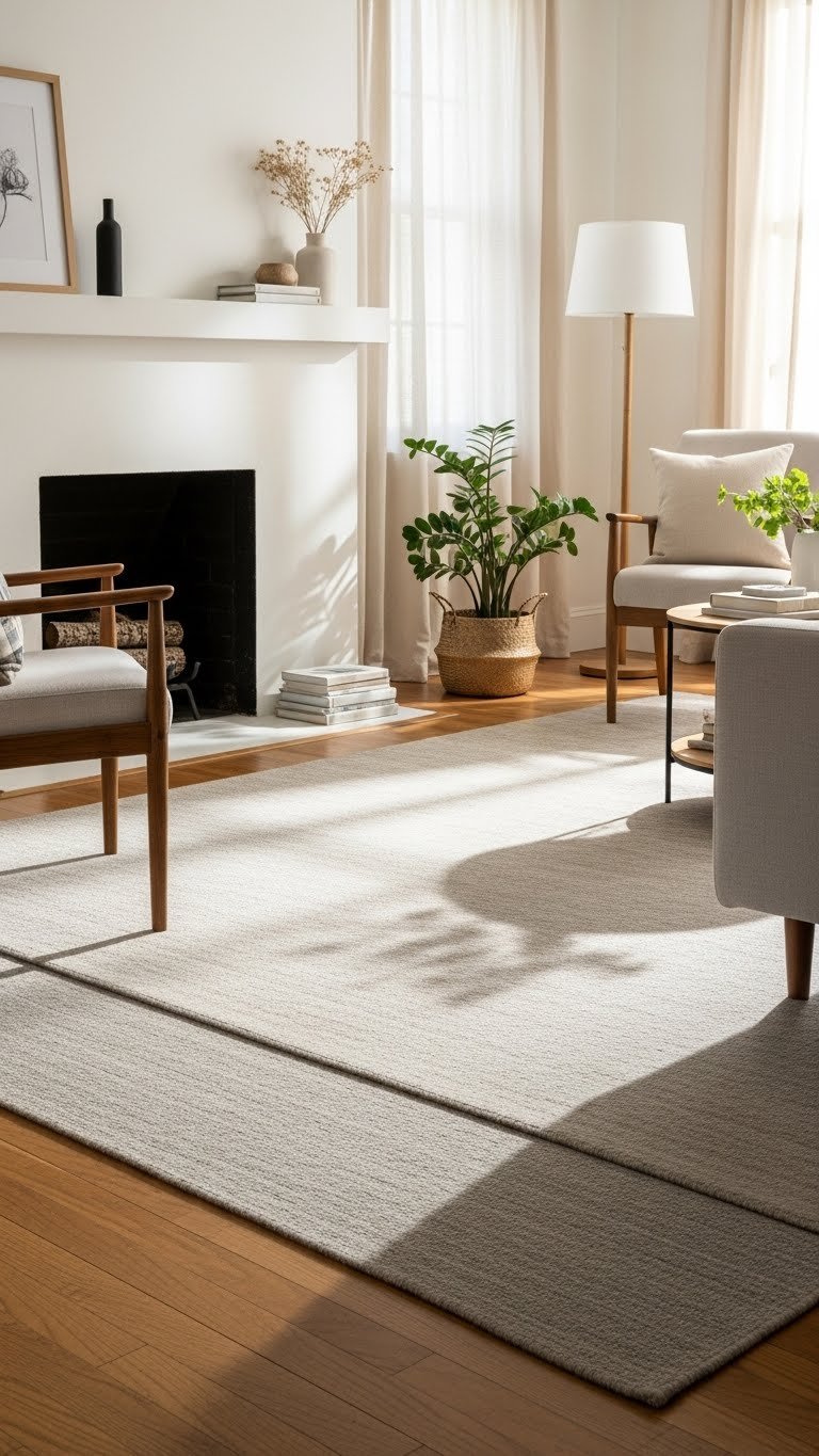 You’ll choose low‑pile neutral rugs texture pieces that ground seating, define zones, and allow freedom to rearrange.