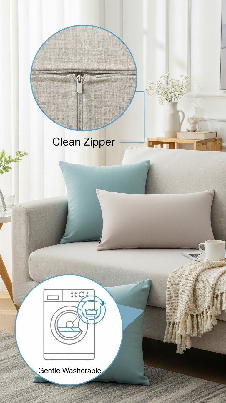 You’ll choose machine washable, fade resistant covers with a hidden zipper for clean lines and easy care. Opt for washable pillows that keep form and freedom, so your living room stays fresh without fuss.