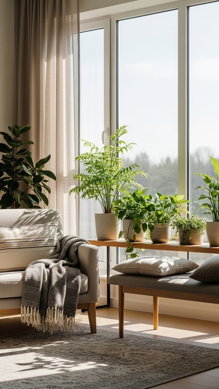 Position a sunlit bench or comfy chair in a bay window, build a cozy reading nook with textured throws, and add a low plants shelf nearby for greenery.