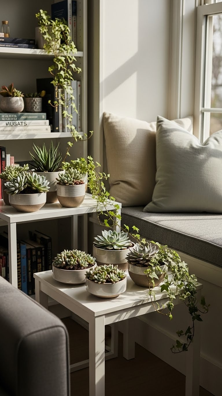 You’ll mix succulent clusters in low ceramic pots with a few trailing ivy stems to add movement and soul.