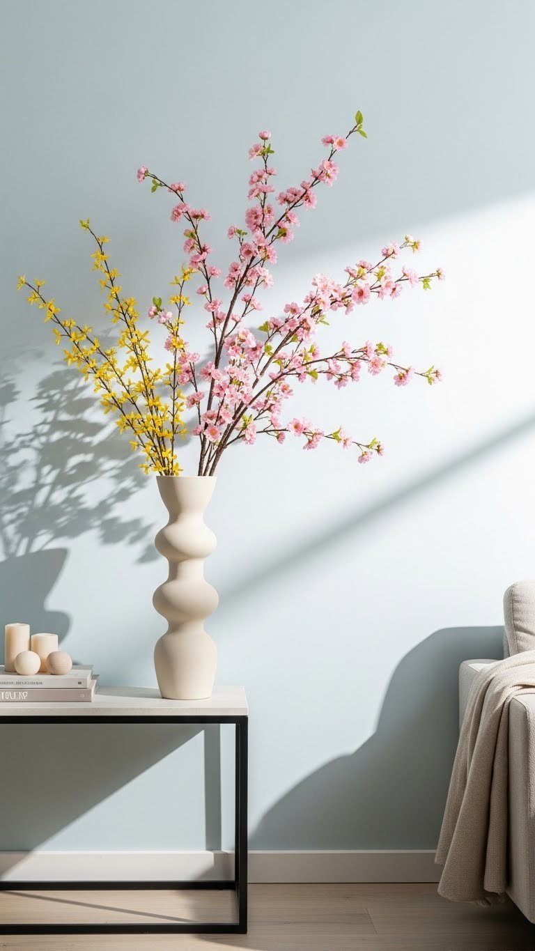 Add faux cherry blossom branches to give your living room an instant focal point that feels seasonal without the maintenance. You’ll place silk blossoms in a sculptural vase, letting the branch silhouette cut a clean line against light walls. Mix in a few faux forsythia stems for contrast. The blossom silhouette reads bold yet effortless, freeing your space and routine.