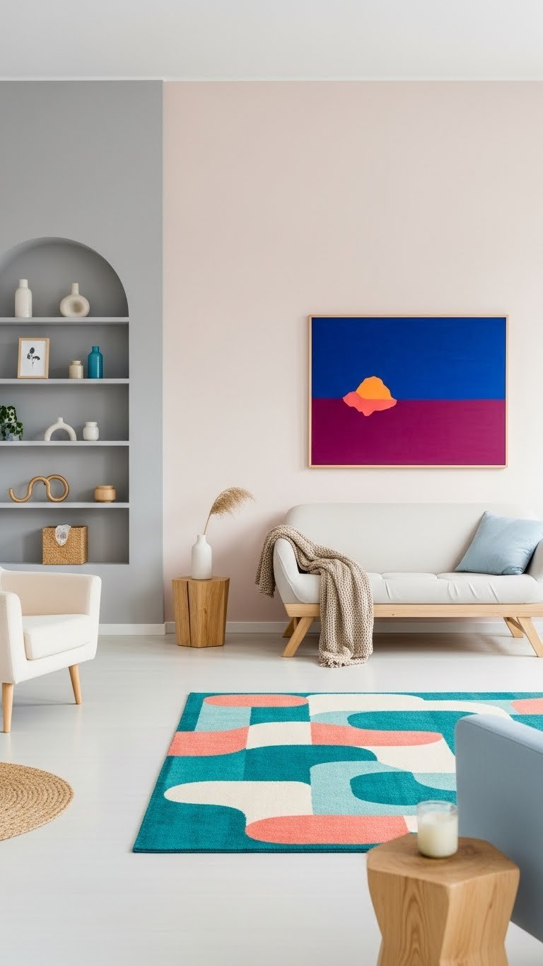 Once you’ve nailed a calm pastel shelf, keep the rest of the room restrained by committing to one bold rug or artwork per zone. You’ll create a monochrome focal without overwhelming your senses: let a single vibrant piece sit against a muted palette.