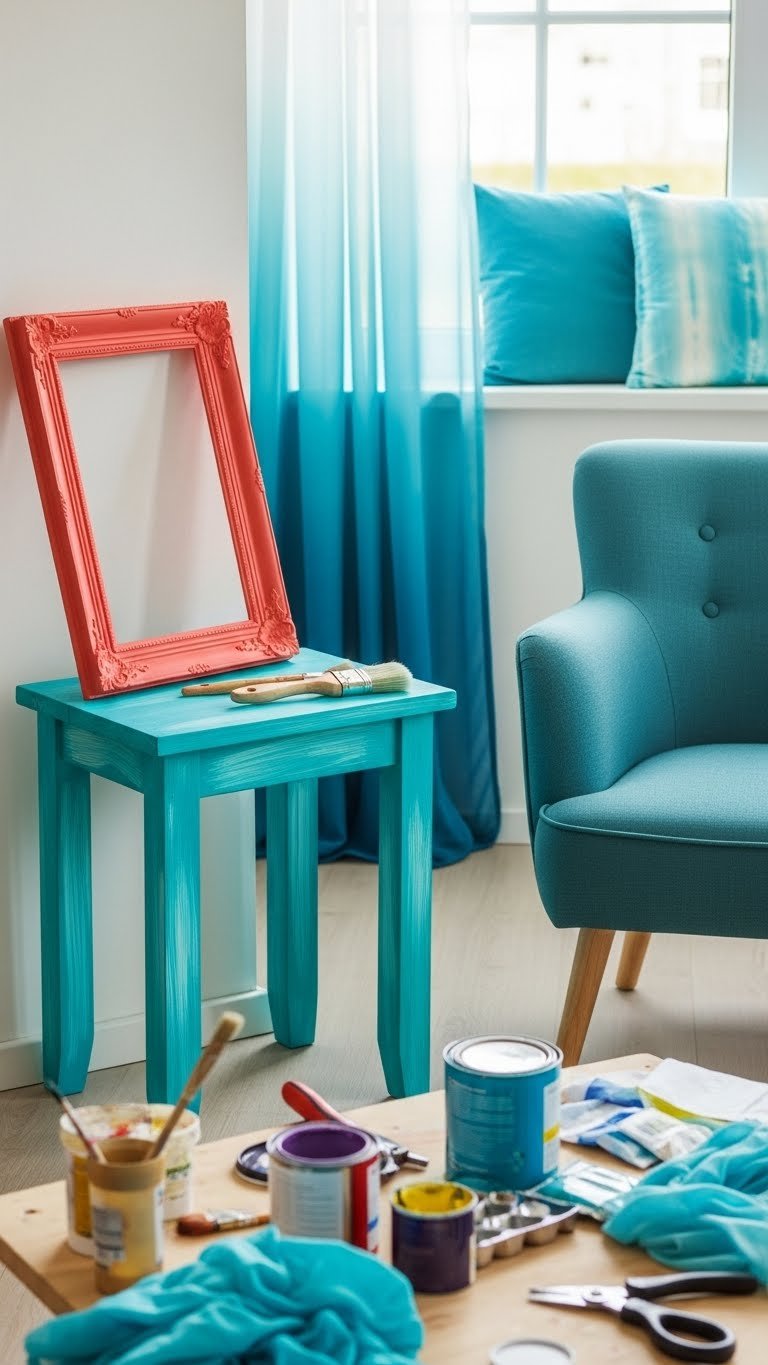 You can try fabric dyeing to modernize curtains or cushions, paint frames and tables in bold, freeing hues, and add subtle button embellishment for texture.
