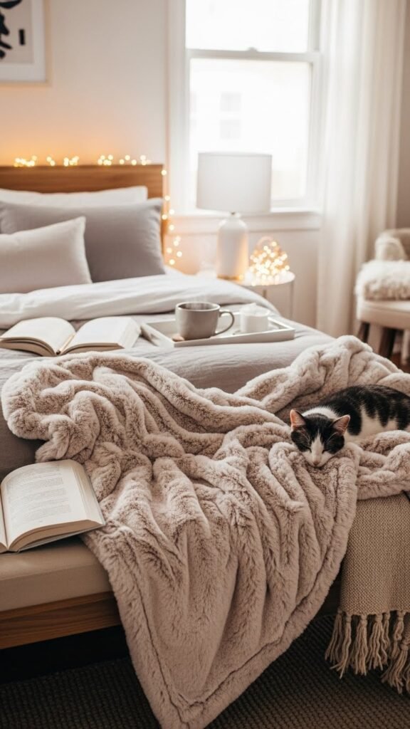 Drape one in a soft neutral or blush to invite cozy reading sessions, add movable warmth for lazy mornings, and pick a pet friendly fabric so your cat or dog can snuggle without ruining the look.