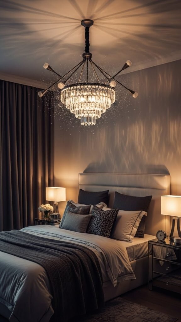A crystal or statement chandelier can instantly elevate your bedroom from cozy to couture, casting layered light and a focal point that feels celebratory without overwhelming the space.