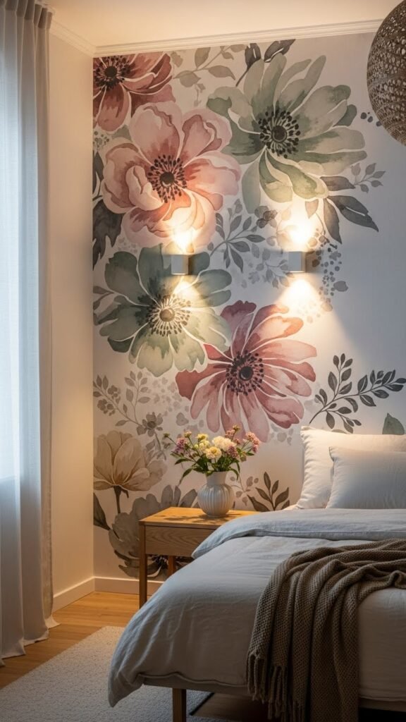 When you choose a romantic floral mural accent wall, you turn a bedroom corner into a focal point that anchors the whole scheme; think oversized blooms in muted tones or a watercolor wash that reads soft and modern rather than busy. You’ll pair botanical stenciling with layered mural lighting to create depth, keep palettes airy, and let the room breathe — bold, free, and effortlessly chic.