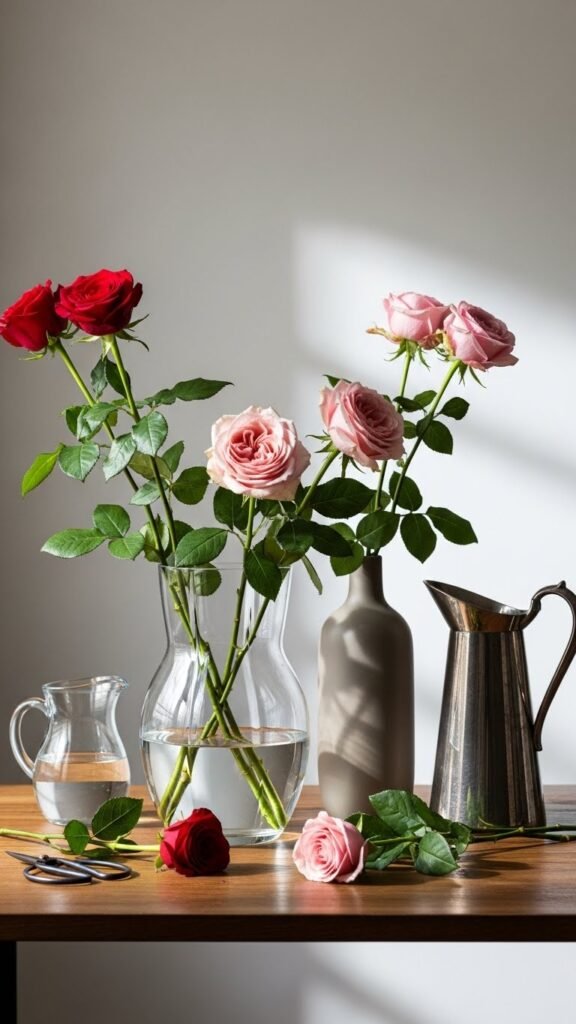 You’ll enjoy effortless freedom by focusing on vase selection and simple rose care: trim stems, change water, and rotate blooms away from direct sun.