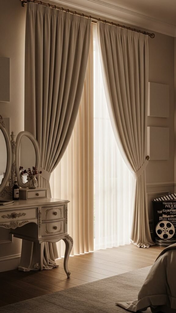 After you style a vintage vanity, anchor the room with velvet blackout curtains in creamy ivory to balance texture and light. You’ll enjoy sculptural drape and superior blackout efficiency—perfect for late mornings and cinematic nights.