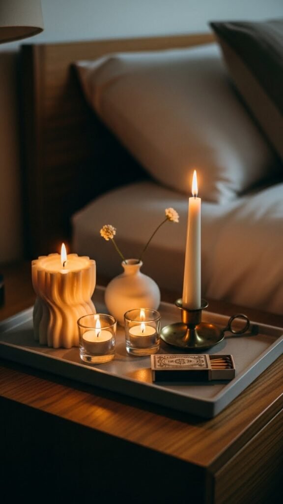 With a low tray and a few carefully chosen candles, you can turn a bedside table into an intimate, hotel-worthy vignette that feels both curated and effortless.