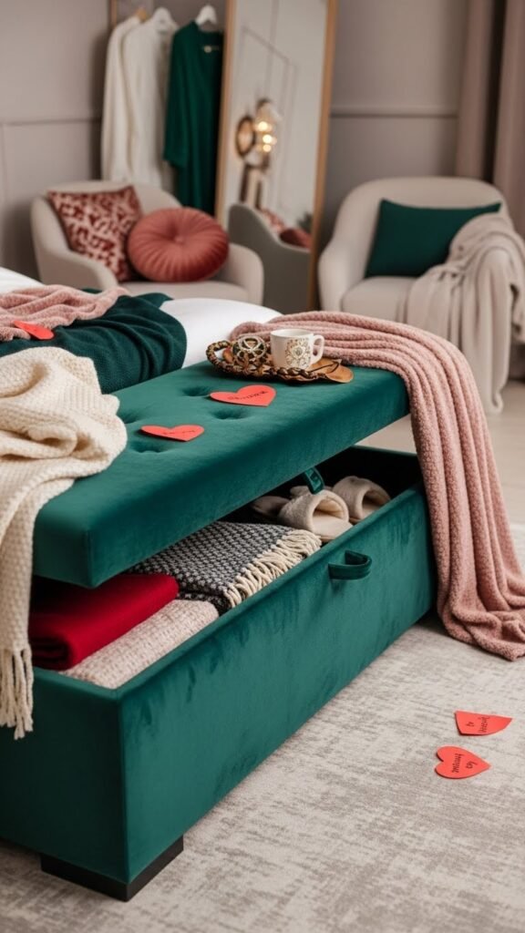 You’ll love velvet storage for stashing throws, slippers, or secret notes, while ottoman seating gives flexible spots for dressing or lounging.
