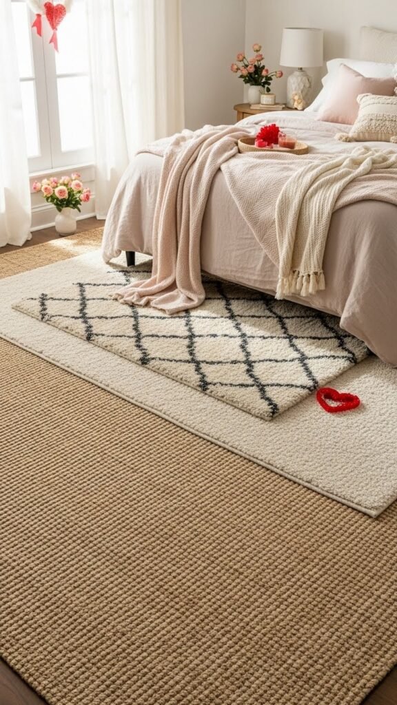 Layering rugs can instantly warm up your Valentine bedroom while adding rich texture and visual depth; mix a low-pile jute or sisal base with a plush, patterned wool or faux-shearling throw rug on top to create contrast underfoot.