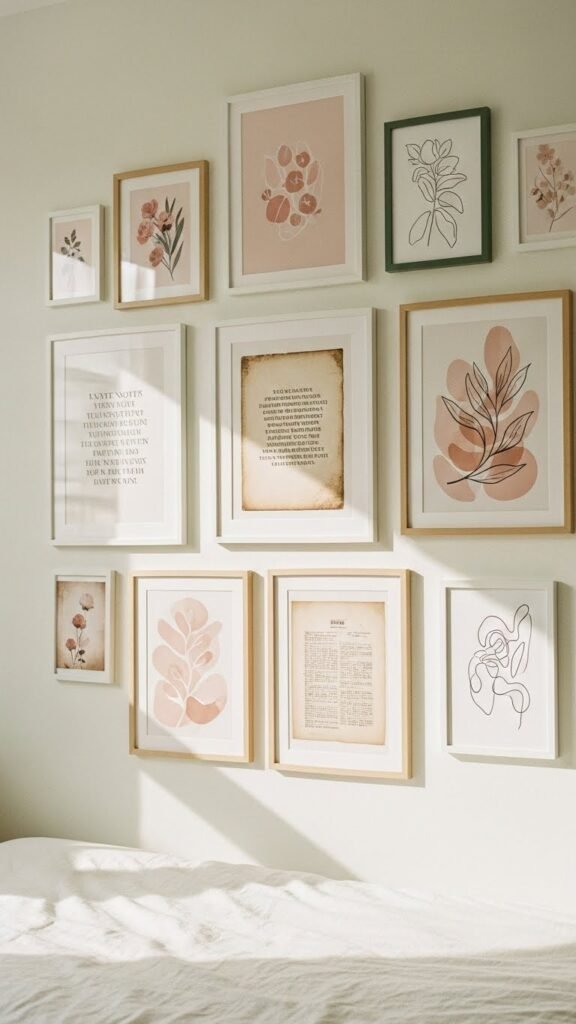 You’ll pair framed poetry with minimalist line drawings and vintage lithographs, varying frame sizes and negative space.