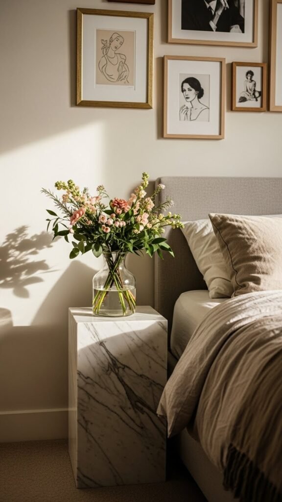 After the gallery wall brings art and poetry to eye level, a small pedestal table next to the bed lets you carry that romantic mood down to a tactile vignette. Choose a Marble pedestal for sculptural elegance and place a Seasonal bouquet in a simple vase. You’ll enjoy liberated, curated charm—minimal clutter, maximum impact—letting scent and form set a free, intimate tone.
