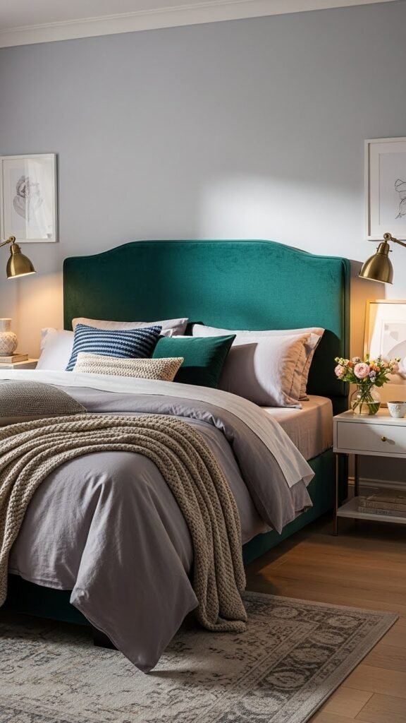 Choose a plush headboard in jewel tones to create contrast and confidence; deep emerald, sapphire, or ruby invite boldness while keeping the room serene.