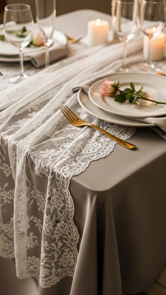 When you layer a sheer lace overlay atop a silk-smooth satin base, the table instantly feels softer and more sophisticated.