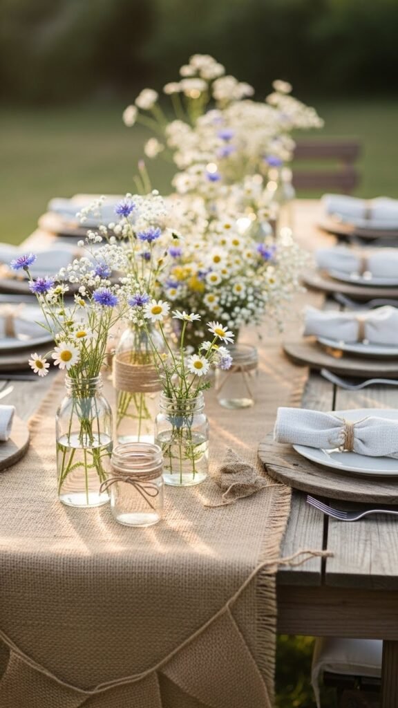 Anchor the setting with a raw-edged burlap runner and let scattered wildflowers soften the look—think daisies, cornflowers, and sprigs of baby’s breath tucked into mason jars or tied with twine around mismatched bottles. You’ll weave a delicate burlap garland, place a low wildflower centerpiece, add textured napkins and weathered wood chargers, and keep the arrangement airy so guests feel unfettered and welcomed.