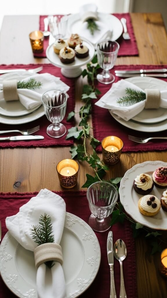 Although rooted in nostalgia, this vintage red, white, and green spread feels fresh and deliberately curated: imagine chipped white china framed by deep cranberry linens, sprigs of evergreen tucked into linen rings, and small brass votives casting a honeyed glow. You’ll pair antique china with crisp white napkins, drape a delicate ivy garland down the center, and arrange petite desserts for an intimate, liberated celebration.