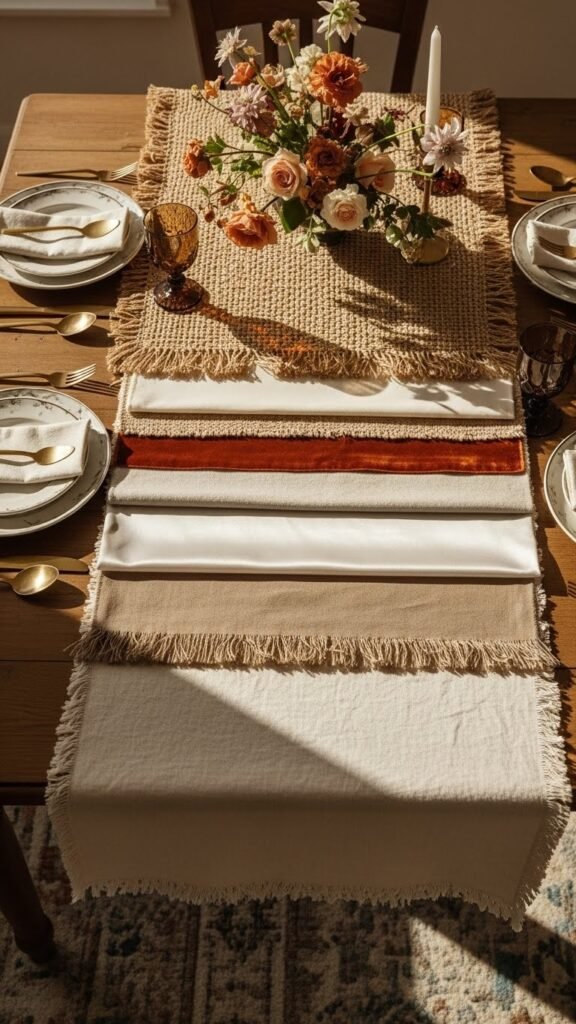 You can build on that vintage spread by stacking runners to add depth and texture across the table. Layer Textured Layers—linen, woven sisal, silk—offset with a slim velvet strip for richness. Let Fringe Contrast peek at the edges, playful yet tailored. You’ll create a chic, liberated tableau where tactile details guide the eye and invite guests to linger, touch, and savor the scene.