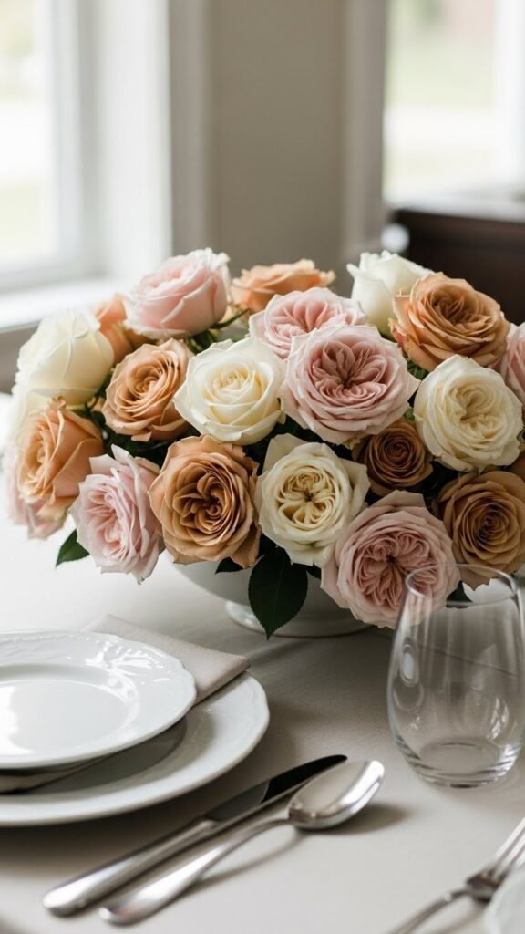 Anchor your table with a low, lush rose centerpiece that reads timeless and intentional: choose tight, garden-style blooms in two or three complementary shades, trim stems to sit just above plate height, and arrange them densely in a shallow vessel so petals spill softly to the rim.