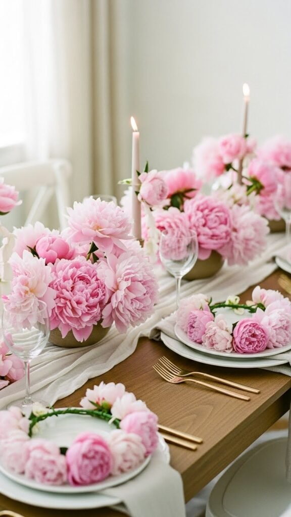 When you want the table to feel soft and indulgent, tuck voluminous peony blooms into low, rounded vessels so their ruffled petals spill casually across the surface; keep stems short to maintain intimacy and let the flowers read as one lush ribbon down the center. Add peony crowns at place settings and drape delicate peony garlands between candles, embracing a liberated, chic calm.