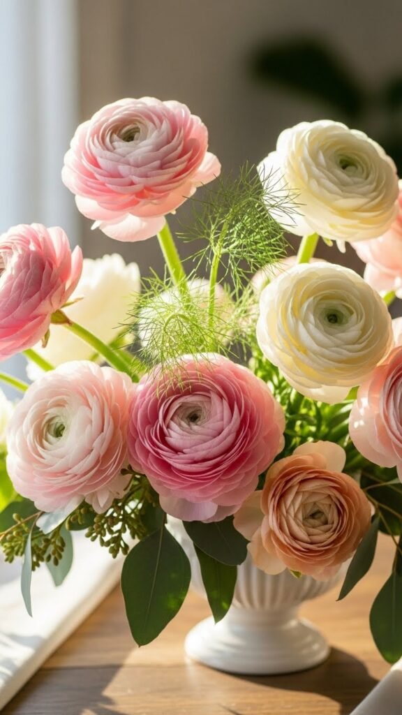 You’ll arrange soft pastel blooms in a low vase, letting layered petals resemble delicate paper ruffles.