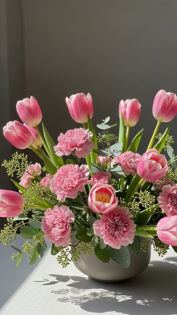 You’ll arrange varying heights to show tulip textures against soft carnation contrast, tuck in airy greenery, and choose a low matte vase so blooms breathe.