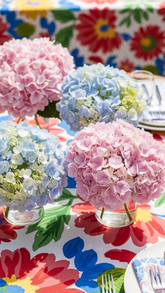 After enjoying the soft pink textures of tulips and carnations, bring in bold surface pattern to change the mood: pair voluminous hydrangea clusters with a printed tablecloth to create contrast and depth. You’ll layer hydrangea patterns against printed linens, choosing scale and color to free the eye. Arrange blooms low, let fabric sing, and let guests wander visually without rules.