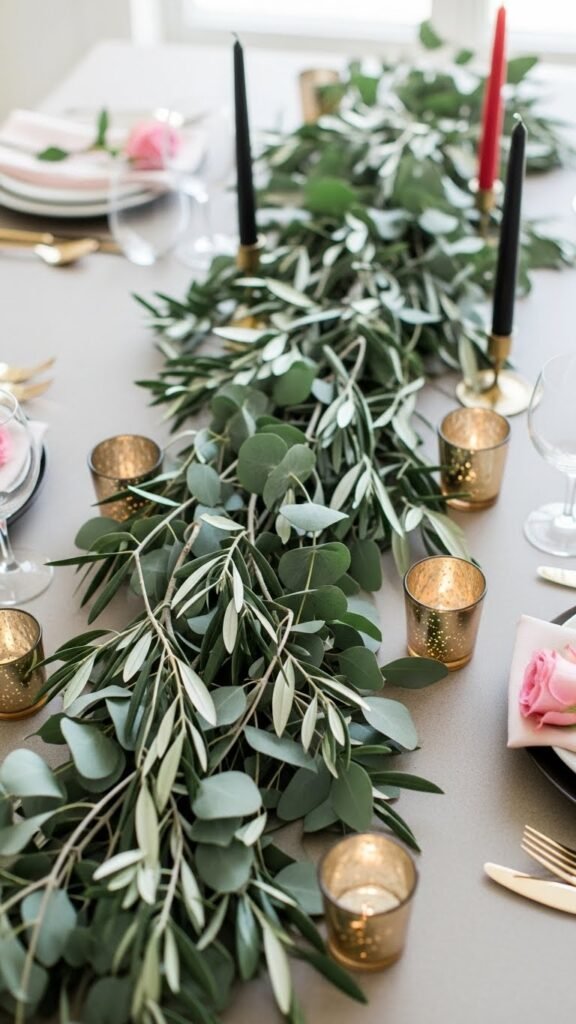 A long, low runner of eucalyptus and olive branches makes a chic, modern statement down the center of your Valentine table, its silvery-green leaves and matte olive tones creating a cool, sophisticated counterpoint to pinks and reds.