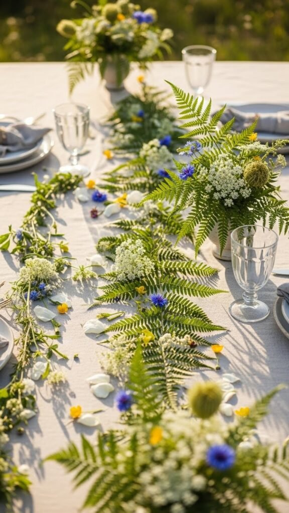 Often you’ll lean into an effortless, slightly wild vibe by laying a loose runner of feathery ferns punctuated with small, untamed blossoms — think Queen Anne’s lace, cornflowers, and buttercups — so the table feels like a fresh-foraged moment.