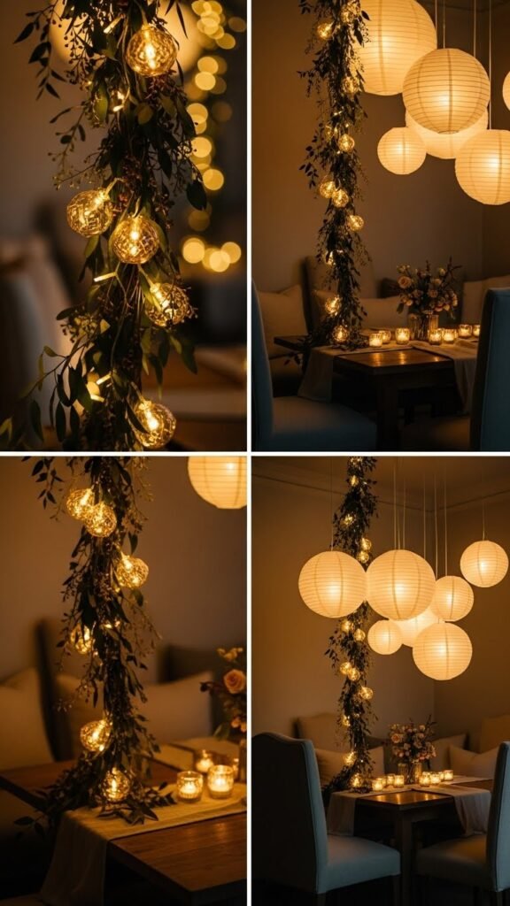 You’ll weave soft fairylights through garlands, suspend paper lanterns at varied heights, and position tiny clusters to carve conversational nooks — a liberated, chic glow that feels effortless and curated.