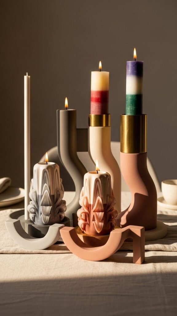 You’ll choose scented holders with clean lines or bold curves, pairing muted tones and metallics.