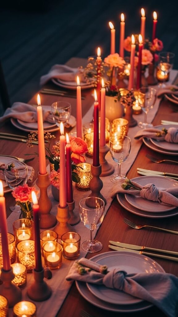 You’ll arrange varying heights of blush and moody magenta tapers, cluster glass votives for an amber glow, and leave space to breathe.