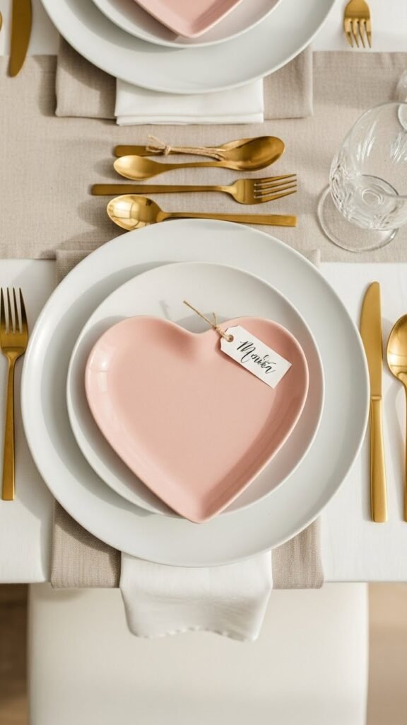 Layer heart-shaped plates across the place setting so each guest immediately feels the occasion—stack a matte white charger with a smaller blush ceramic heart on top and let the plate’s soft silhouette peek beneath your gold flatware.