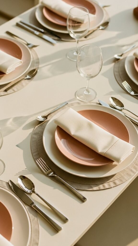 As evening light warms the table, arrange blush and white place settings so the palette reads soft and deliberate—matte white chargers anchor glossy blush salad plates, while crisp, starched napkins fold into clean rectangles beside gleaming cutlery. You’ll layer subtle linen textures under plates, add minimalist chargers for calm structure, and leave negative space so each element breathes, inviting relaxed, liberated dining.