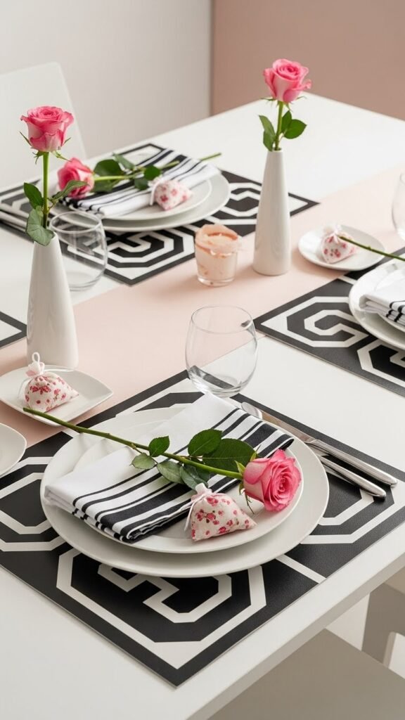 If you want a sharper counterpoint to the soft blush setting, introduce graphic black-and-white placemats topped with a single stem of fresh rose at each seat. You’ll balance bold pattern with delicate bloom, fold monochrome napkins crisply, and tuck tiny rose scented sachets beneath plates for a subtle perfume. The result feels modern, liberated, and effortlessly refined.