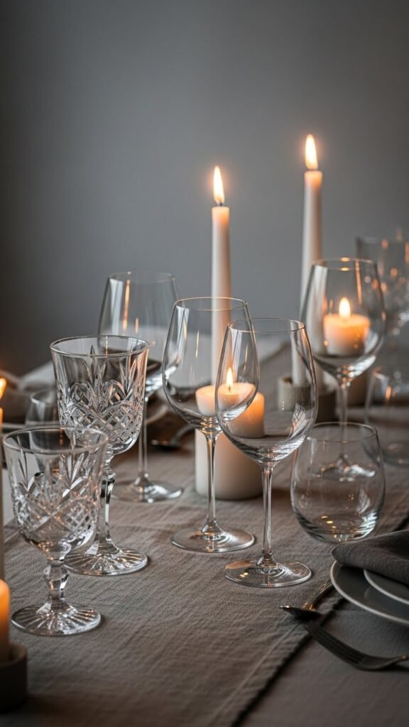 Mix in a gleam of history and modern polish by pairing cut-crystal vintage goblets with sleek, stemless wine glasses so each place setting catches the light differently. You’ll create a liberated, gallery-like table where mismatched goblets mingle with minimalist forms; vintage stems add texture and stories. Place them on a neutral runner, let candlelight sculpt glass edges, and invite effortless, joyful toasts.