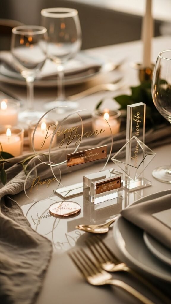 Bring that curated table to a personal level with custom name cards and acrylic keepsakes that catch the same candlelight as your glassware. You’ll choose sleek personalized acrylic tokens — slim discs or geometric blocks — paired with minimalist nameplate engraving for guests. Place them like small sculptures, mixing metallic fonts and translucent edges. They free your styling, feel modern, intimate, and utterly intentional.