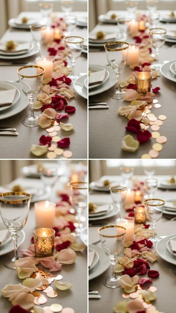 Against a backdrop of neutral linens and warm candlelight, scattered rose petals and a hint of metallic confetti turn your table into a tactile invitation—soft petals trail between plates while tiny gold and rose‑gold discs catch flickering reflections.