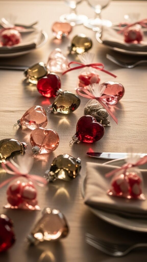 Tuck delicate heart-shaped glass ornaments along the runner and pair them with small candy bags for a mix of twinkling texture and sweet surprise; the glass catches the light—soft halos of rose, ruby, and smoky quartz—while semi-translucent cellophane bags tied with thin satin ribbon echo those hues. Arrange glass hearts with tiny candy sachets at each setting so guests feel cherished and free.